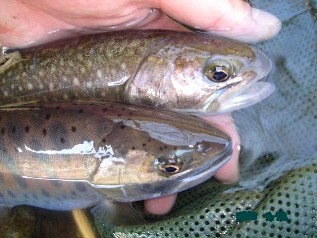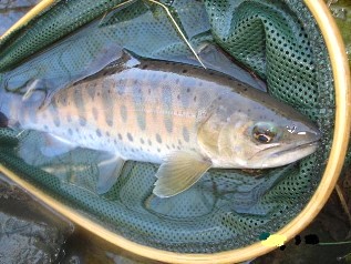 | 今日は有給取って釣行 早朝から意気揚揚と車を駆ります! 浦和ICに近づくと電光掲示板に怪しい文字が・・・ えーっ、なになに、高速道路が『霧』で途中通行止め!? なんでー? 仕方なく途中から下道で・・・うぉっ、ゲロ混み! なんとか栃木県に入ったけど、目的の川には行けないなぁ と、行き先を思案したところ、へちいさんに教わった川が一番近いので、試しに・・・ 現地に到着して場所を探してみると、それらしき場所が・・・ でも、すごーく怪しい! はっきり言ってドブです 半信半疑で観察していると、魚影発見 いるいる、いるじゃん! てな具合で、川に下りたらすぐ釣れた びっくり、岩魚29cm! またまたびっくり、ヤマメ27cm!! このヤマメなんか、体高と顔がすごいんで 初『尺』?って思ったのに、ちょっと残念 その後は、さっぱりアタリが無くなったので他の川を覗きに・・・ ちびヤマメを釣って納竿しました ツイてるのか、ツイて無いのか?微妙な日でした |