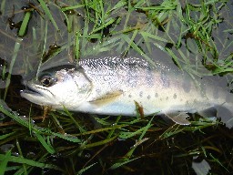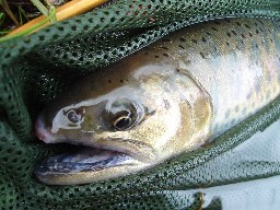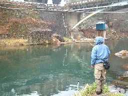 | 前日の大阪出張から舞い戻り、久しぶりにへちいさんと釣行です! まずはH川へ 去年初めて来た時は、非常に人が多かったけど今日はどうだろう? 釣具屋のお母さんに、『たくさん釣れるように祈ってて〜』なんて 釣り券を購入し、街中の大きなプールで実釣開始! 冷たい雨の中、目の前のライズに夢中でキャスト〜 おっと、いきなりヒット! 意外と大きいので慎重に取り込み、へちいさんに計測して頂くと なんと29cm! でも、よーく見てみると、立派なグ〜ヤマメ(笑) ふぅ〜、尺上じゃなくて良かった 初の尺上ヤマメがグ〜ちゃんじゃ、ちょっとねぇ? しばらくして、へちいさんが50UPもあろうレインボーをヒット! 残念ながらブレイクしちゃったけど、やっぱり上手いなぁ〜 次は下流に移動 うわっ、露天風呂があるよ! いいなぁ〜、っておじさん入ってるし・・・ あまり見ないようにしてたけど、向こうも嫌だっただろうな(爆) で、頑張ったけど寒さで手足がマヒしちゃって、ガマンできないので足湯へ おぉっ、手足が大きくなってくる〜! 解凍までしばし休養・・・ 次は風が弱そうな場所を2箇所ほど案内して頂きましたが 風が強すぎて自分の腕じゃ太刀打ちできない・・・ こんな時は、後ろから上手い人を見るのが一番の勉強になりますね