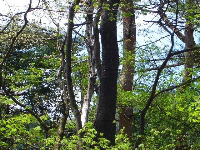 | カカカ、カカカ、カカカカカ・・・ 聞き慣れない音が聞こえます 辺りを注意深く見回すと・・・ なんと、キツツキ(驚)!? 画像中央の木の、真ん中チョイ下に居るの分ります? |