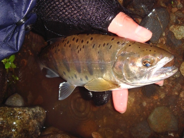| 前回同様♯4のタックルに5Xティペット、偽マドラーミノー×1本仕様で挑戦(無謀?) ※ちゃんと♯5、6、8のロッドもありますがロクに振れませんし、ドロッパーの結び方もわかりません(爆) ただ雨の中、もくもくと自分の出来るキャスティングとリトリーブを繰り返していたら・・・、『ガッ!?』 うへぇ〜、また何か掛っちゃったよ! で、リールファイトしたくても、ラインを出し過ぎて巻くのに時間がかかり ランディングしようにも、ネットが金具から取れません(焦) その間、わずか2・3分? 上がってきたのは、太っとい本流ヤマメ 27cm♪ 尺には全然足りませんが、今の自分(技術)では充分っす(嬉) |
