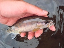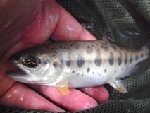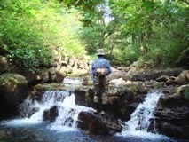 | 前夜メールで連絡を取り、最後?は子育てパパさんとnona沢へ♪ で、現地に8:00に到着すると先行者の車(涙) こんなマイナーな沢に先行者って驚いたけど、既にウェーダーが濡れていたパパさん! やりますな・・・ |