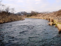 | 待ちに待った解禁・・・ なのに、なんだかちょっと気が乗らないんです??? 寒いし、眠いし、体中筋肉痛だし(笑) で、ウロウロ川を見て回っていたら、釣三さんからお告げが!!! |