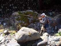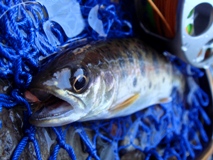 | 風裏の小沢で水温6℃ | 竹竿&ヤマメ(羨)! | 自分のイワナは撮影前にトンズラ(笑) |