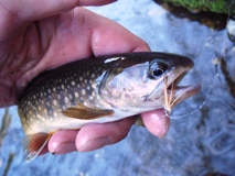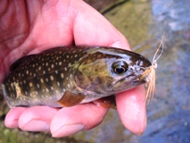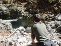| で、今回ご一緒させて頂いたのは hosさん、yossyさん2名の山遊びの達人に、イワナ釣りと沢登りが初めてのyossyさんの甥っ子さんと、自分の4名♪ 心強い山の達人に伴登して頂き、半ベソをかきながら超危険な崖登りを終え、難所を数ヶ所トラバースし・・・ や〜っと、フリフリ開始♪ |