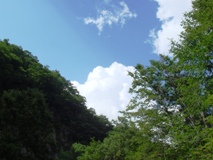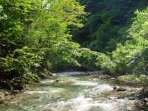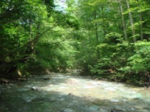 | 途中、事故渋滞やら帰省によるプチ渋滞がありましたが、まずまず順調〜(喜) でも、目的の渓に到着するとかなりの増水&ドロ濁り・・・ 仕方なく上流の濁りの少ない所まで遡り、フリフリ開始〜 |