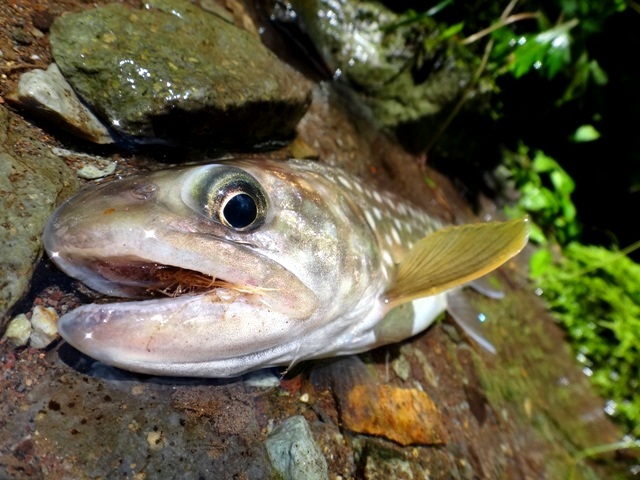 | で、はじめ全然釣れなかったイワナが、ついに入喰い♪ になった頃、予報より早く雨が落ちてきました・・・ しかも雷様を連れて(涙) |