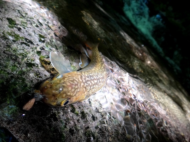 | で、前々から狙っていた大場所の謎の魚影・・・ 手前にクルージングしてきては、何かのミッジをついばむ8〜9寸クラスのイワナ?に遊ばれた後 ダメもとで♯12のEHCを奥に投げ込んでたら・・・ いきなり、水飛沫!! |