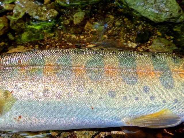 | パーマークに特徴がある尺ヤマメ(嬉) 思えば先に釣ったヤマメのパーマークも、真中が少し桜色のような気が・・・ で、肝心のサイズは35? 34.5cm? 暴れて上手く測れませんでしたが、初?尺ヤマメだし オマケで35cmってコトで(笑) う〜ん、ここしばらく仕事も釣りも我慢の連続だったので、何だかご褒美を頂いた気分です♪ |