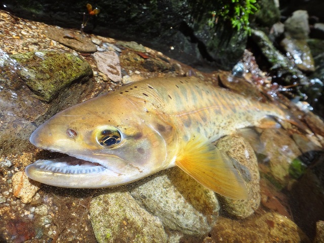 | いつも思うけど、イワナの顔って可愛いねぇ〜 お次は、ここの上流域では初めてのヤマメ! しかも、2匹連続で釣れちゃいました(驚) |