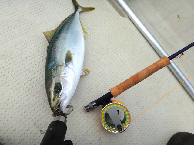 | 先輩は40cm前後のカンパチ数匹に、サバ&ダツ、36cmの大アジまでGet!(羨) 肝心の自分は・・・ 相変わらずナブラ祭りが続いてるのに、♯6で大物ファイト中に、リーダーとフライラインの接続部が抜けたり 2Xラインがブッチ切られたりと、バラしてばかり(涙) |