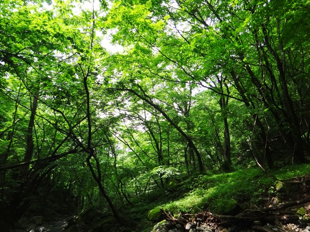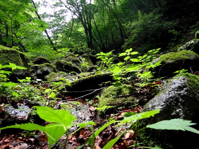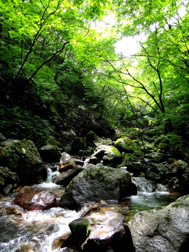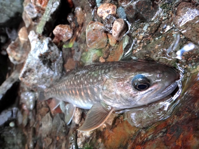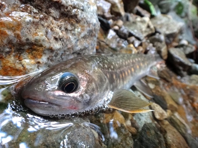 | 最近ご無沙汰している沢にも何箇所か行ってみましたが、こちらは木陰が無くって暑い暑い! まっ黒イワナで〆♪ |