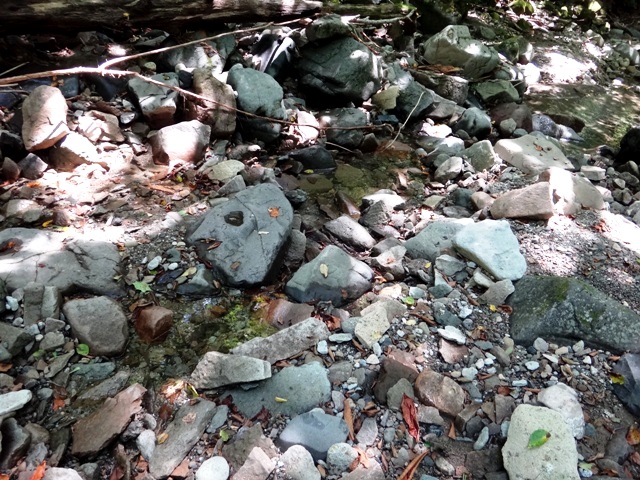 | がっ、入渓点に着くと・・・ 初めての沢は、なんと干上がってました(汗) でも先月までは流れがあった筈なので、構わず歩きます〜 結果・・・ |