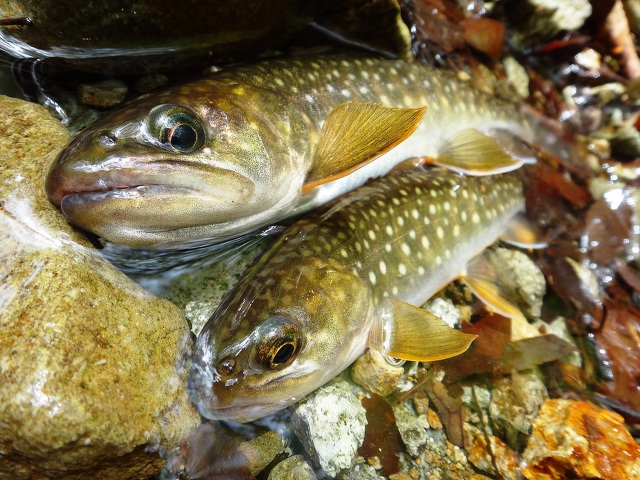 全く魚影が見つからず、初日から期待外れ(涙)!? もう足腰パンパンで、明日からどうしましょう!? って感じで、車横づけの沢で子イワナとニジマスを釣って終了〜 早々にアルコールに慰めて頂き、温泉に浸かりました(笑) |