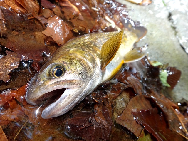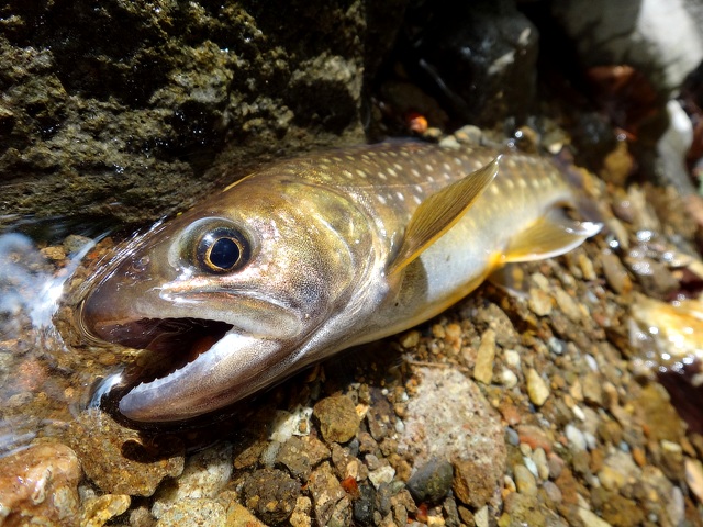 で、その支流の枝沢も偵察に・・・ わずか数百メートルの急峻な小沢でしたが、何とイワナが居ました! |