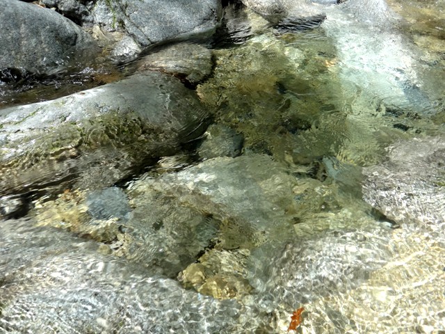 って、朝から快晴で、木漏れ日も眩しい♪ ホントに雨が降るのか半信半疑でしたが、とりあえず白い花崗岩?の渓に突入です! |