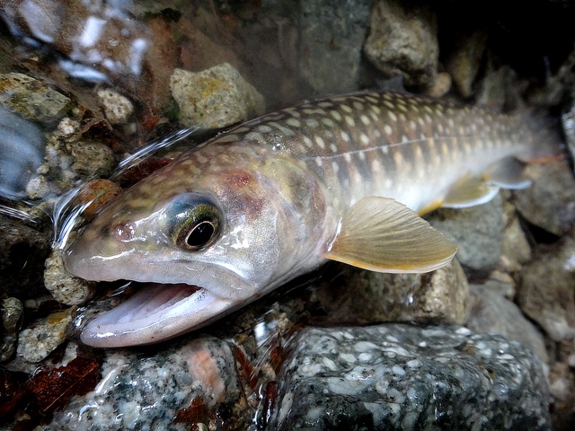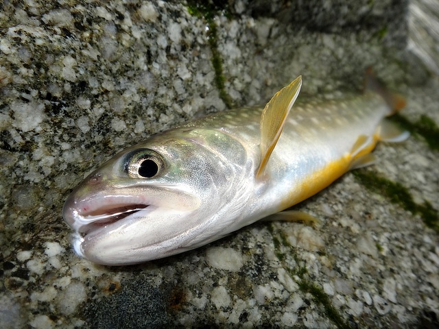 さっそく色白イワナ(喜) 水も透き通っていて、気持ちが高ぶります〜 |
