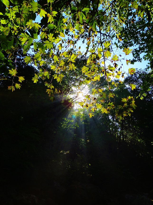沢もゴンゴンと水が流れております(不笑) う〜ん、先週の台風直撃の名残でしょうか?、木漏れ日がキレイなんですけどねぇ・・・ で、とりあえず入渓も・・・案の定全く反応がありません(寂) なので、早々に移動して林道沿いをウロウロしていたら、偶然鉄塔管理用?の杣道を発見(喜) |