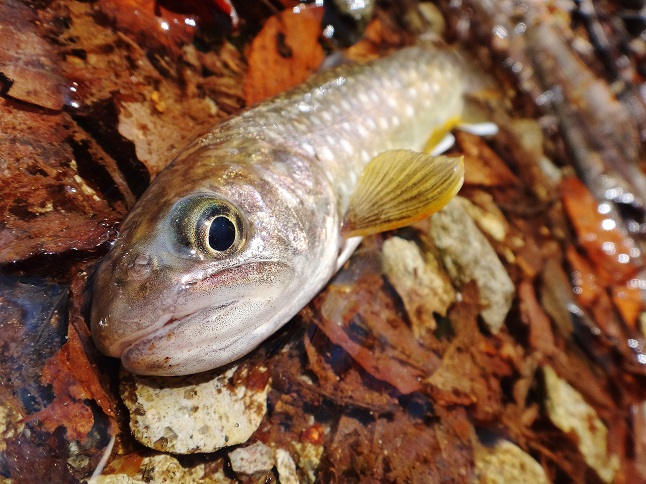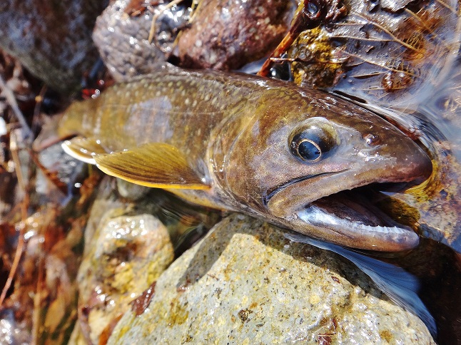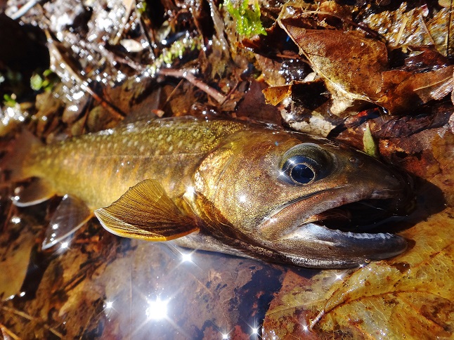 で、風が強かったので深い峪を選びましたが、一つ目の淵が突破できず おまけに高巻も失敗し、早くもカロリー消費です♪ で、車横付けの沢で初めの1匹(喜) |