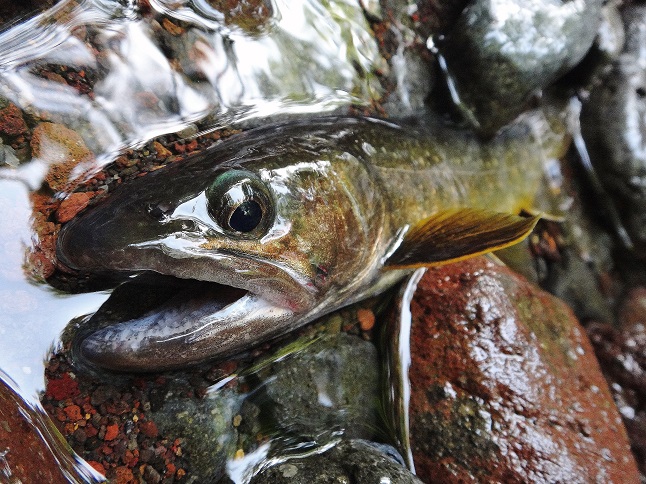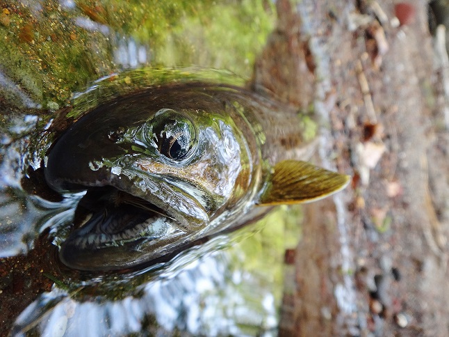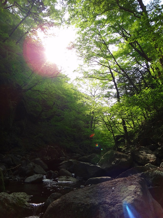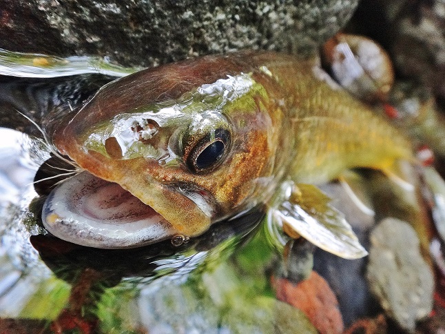 しばらく沢沿いの踏み跡を辿って歩きましたが、不明瞭になった頃に沢へ下降・・・ 中々の渓相ですが、行けども行けども魚影がありません!? 流石に先行者の後追いは辛いかなと思い、斜面を登ってみたら新しい踏み跡発見! さらに歩いて、ようやくご対面(喜) |