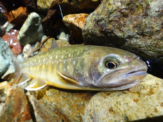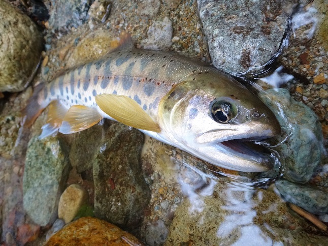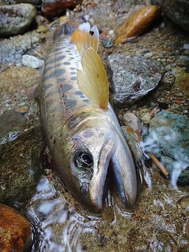 雨の中あまり上手く撮れなかったのですが 腹鰭・尻鰭がオレンジで、尾鰭が赤い満足なギリ尺でした(嬉) 足跡だらけの人気の渓でとりあえず、結果が出て良かったのですが 往復15km以上も歩いて、8匹では腕のなさを痛感です(笑) で、2日目・・・ |