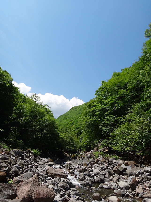 当初は降雨の予報も直前で快晴、最高のロケーションで期待も上がり どんどん登っていきますが、何故か全っ然釣れません??? で、数時間釣り上がっても走る魚影も全く無く撤退(涙) |