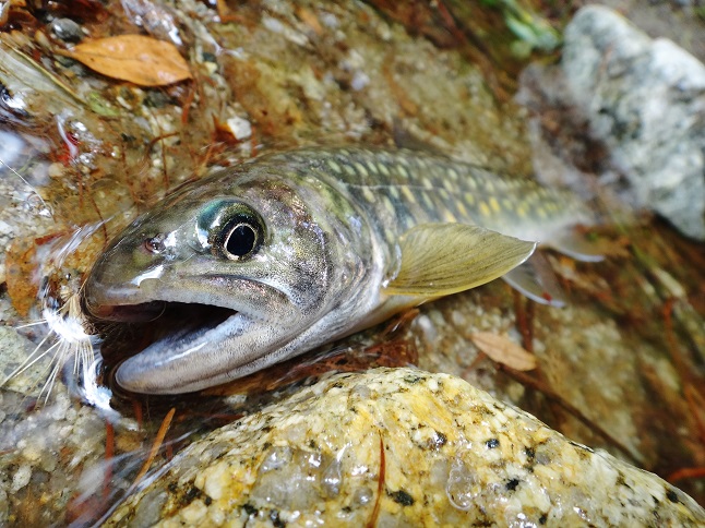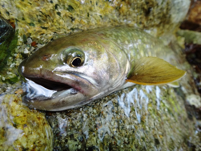 で、堰堤にも良型がついてきて・・・ 最終堰堤を超えた頃からが圧巻! 全てのポイントにイワナが付いていました(嬉) |