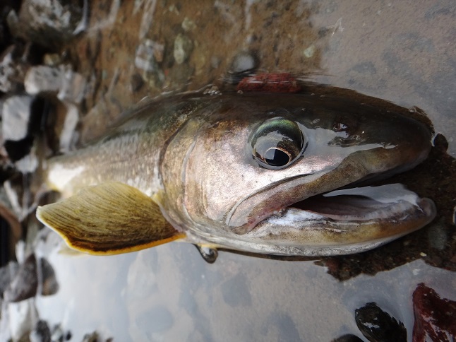 もぉ、面倒だしいつも4.5匹は釣れるので適当に開始です(笑) 何とかドライで2匹出たので暫らく釣り上がりましたが、どうも反応が悪い!? で、いつもはやらないニンフを結んでみたら・・・ |