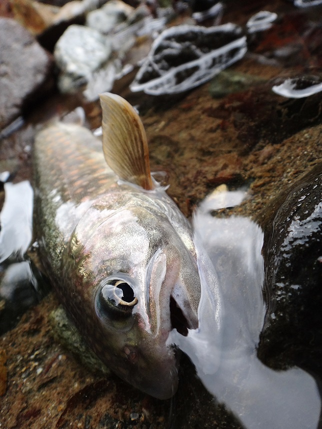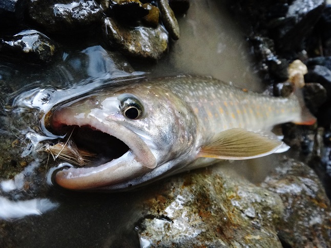 午前中は晴れ間が覗き、開けた渓で気持ち良くフリフリ(喜) |