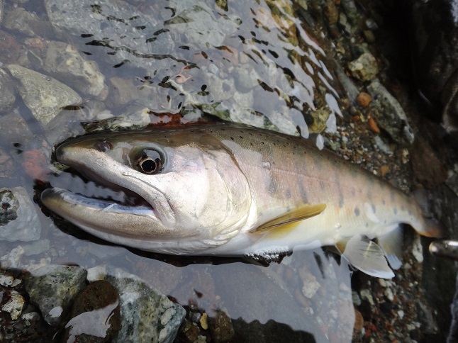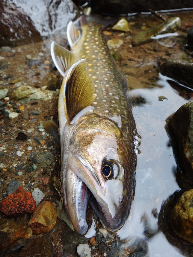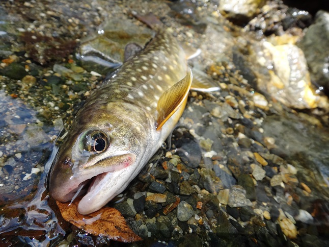 で、嬉々としてガレを登っていきましたが・・・ 何故か全然釣れない??? バラし、スッポ抜けもありましたが2人で2匹(涙) 少し前に知人が30とか50匹釣れたとか言ってましたが、腕の違いですね(笑) このままでは不完全燃焼なので、次の沢でリベンジ! ようやく納得の27cmが釣れてくれました♪ |