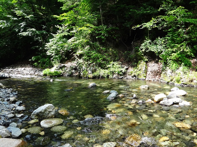 33cmの尺ヤマメ(凄)!!! おまけに数もダブルスコアで負けてしまいました(笑) 久しぶりに良いヤマメが見れて、興奮したまま温泉に入り、翌朝は余裕の9時チェックアウト(爆) 完全に釣りモードではなかったのですが、のんびり山奥に行ってみると意外と釣り人が居ません?? なので、広い渓でラインを伸ばしてフリフリ♪ |