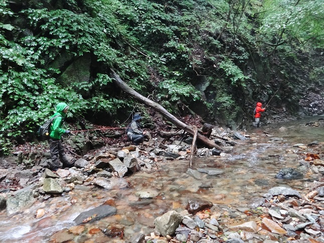 雨ザーザーの中、初めのポイントからkomさんがHIT(凄)! Mさんも早々に2抜けしたものの・・・ 自分とT君には全〜然っ釣れない(笑) これは何年かぶりのボウズも仕方ないかと思いつつ、komさんご提案の次の沢で・・・ |
