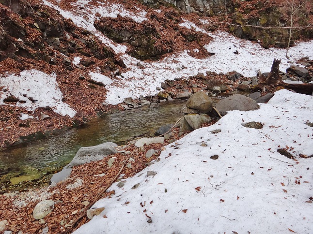 それでも爆竹を鳴らして渓に降りると、残雪たっぷり(汗) |