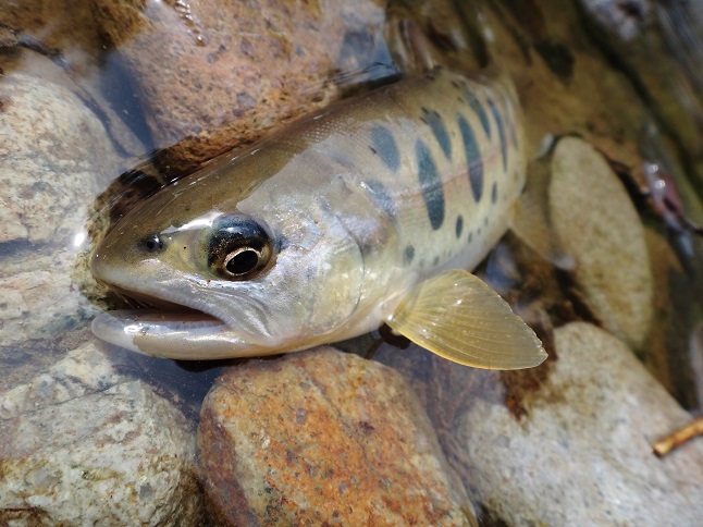 って、天気を気にしても仕方がないのでいつもの山奥に・・・ で、いきなりヤマメさん(喜) |