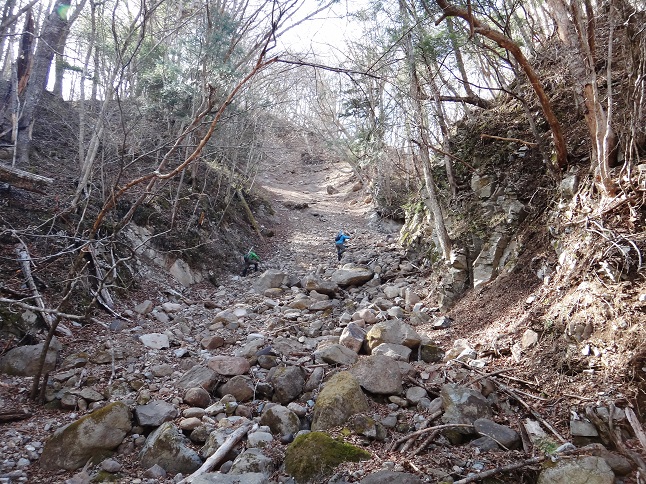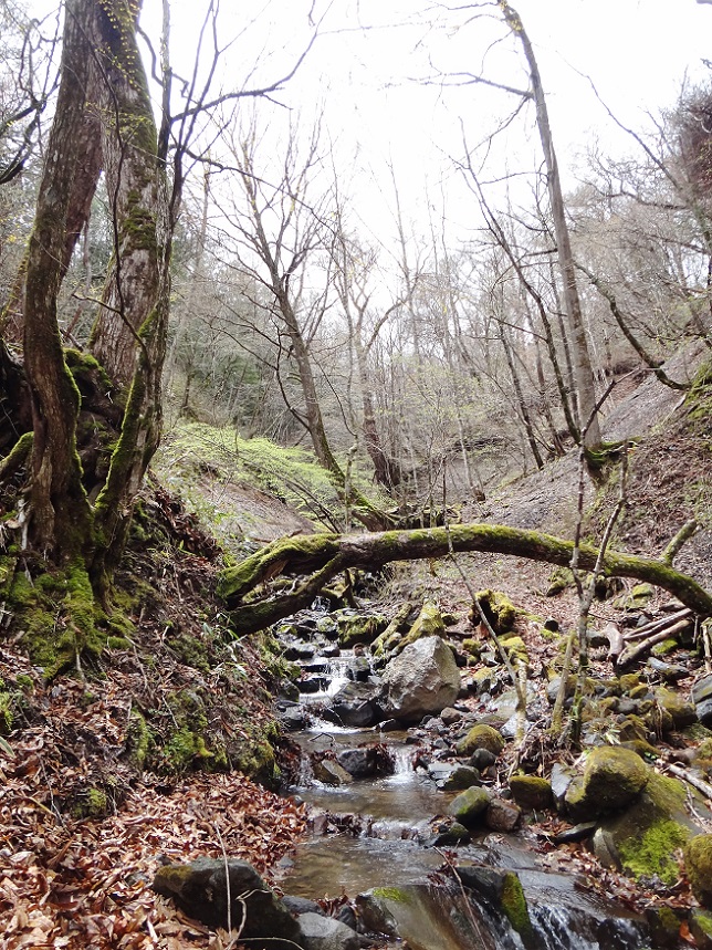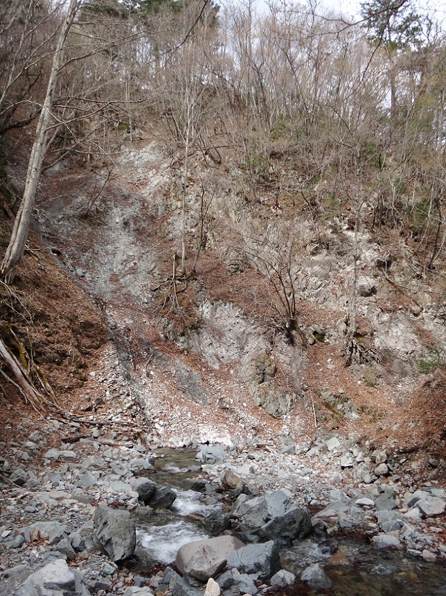 仕方がないので後追いで、長い長い崖を下りますが谷底もまだ冬の装い・・・ |