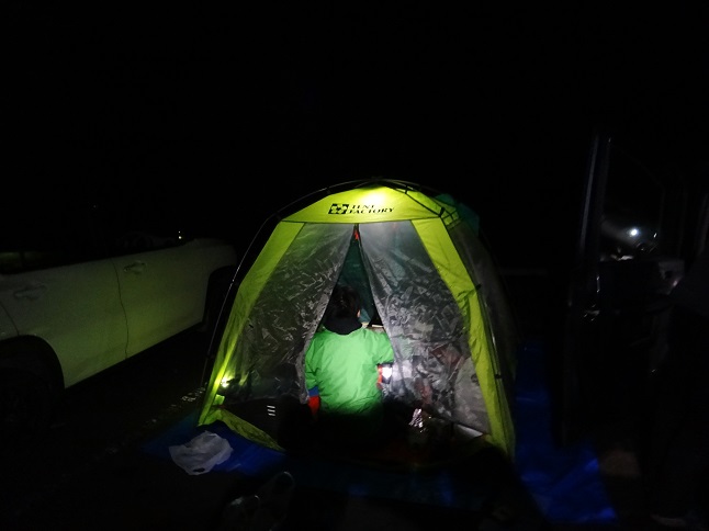 秘密基地にてお酒の会♪ いつものMさんのモツ&鶏皮お鍋に、イノシシ肉、極旨メンマ&komさんのおつまみ からの、T君の焼酎〜赤ワインで泥酔でした(笑) そして2日目・・・朝の気温は0℃! おまけに先行者らしき車(涙) |