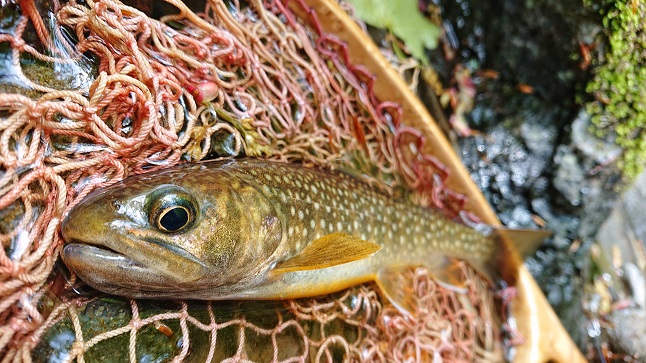 早朝は曇りがちでしたが、時々晴れ間がのぞきます♪ 沢は渇水で、終始肌寒い感じでしたがたまにイワナが釣れてくれます(笑) |