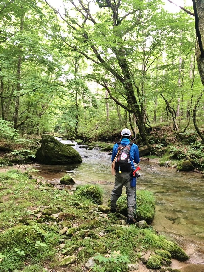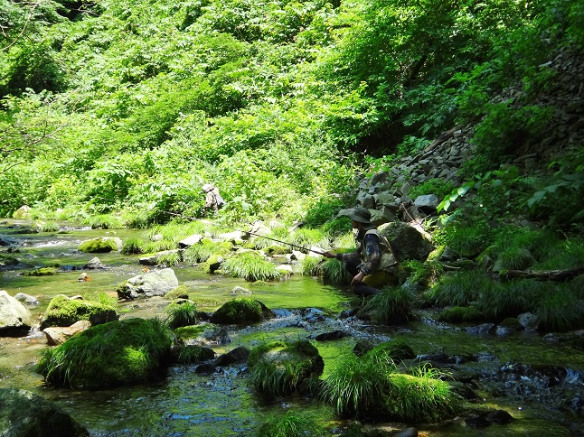 と、初日に初めての渓で右往左往していたら、地元の釣り人達と遭遇! 折角?なので、無理を言ってご一緒させて頂くことに♪ |