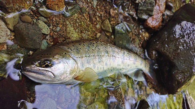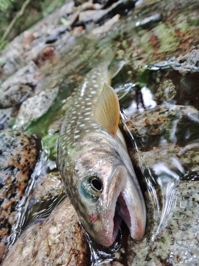 人だらけで頭ハネされてしまいましたが、ポツリポツリ釣れて・・・ 最後はボサ川でkomさんが尺イワナ!!! |