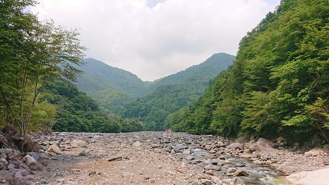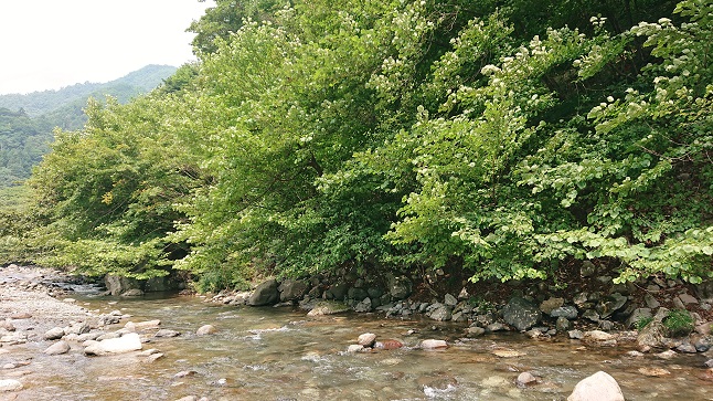 渇水の沢でボウズ逃れのイワナを釣った後は・・・ 開けた渓に♪ |
