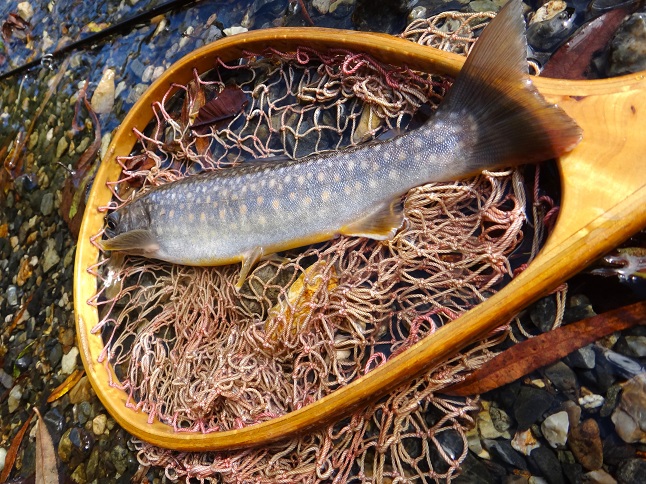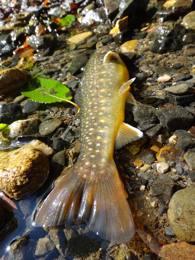 がっ、入渓したら渓が埋まって浅くなってる!? とりあえずラインを出しながら水深10cmほどの浅瀬にフライを乗せたら、いきなり良型♪ |