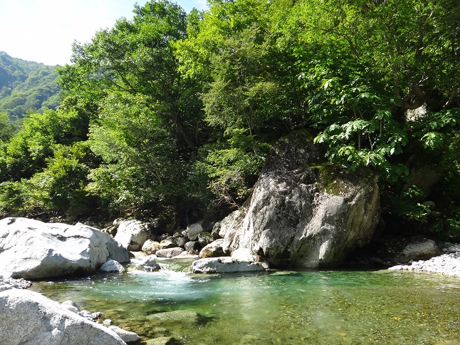 それでも対岸の怪しいポイントを攻めて、尺イワナで初日は〆 2日目も最高の天気でスタート! 入渓早々良型イワナでほくそ笑んでいると、上流で渓泊中のルアーマンが( ゚Д゚) |