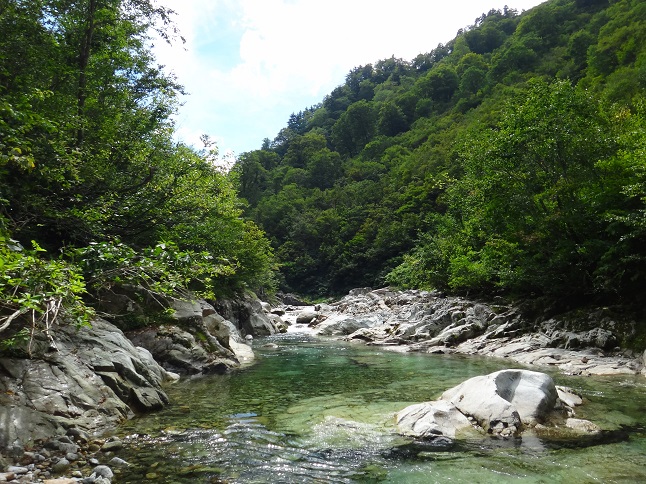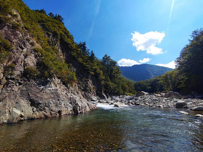 それではと、のんびり開始しましたがやはり魚影が見当たりません(元々この流域一帯は魚影が少ない) 取り敢えず過去の尺ポイントまで行ってみるかとペースを上げたら・・・相当先に居る筈の先行者さん??? 追いついてお話を伺ったら、車止めでワタクシの後から入ってきたフライマンでしたw 結構距離を取ったので大丈夫だろう、鈴の音が聞こえてましたが途中から入りました、と頭ハネ確信犯でした(爆) 本来なら譲っていただく事も考えましたが、同じく関東から連休で来たと言うし、フライを初めて4年目とのことで 尺ポイントまでご一緒することに(^_^;) |
