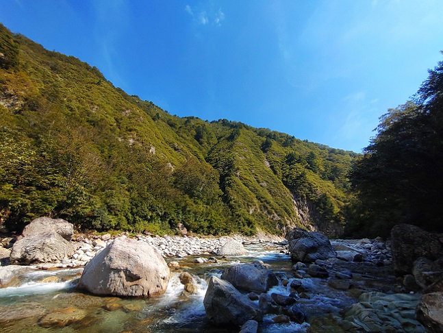 今季も訪れたいと思っていた渓に、やっと来れたのに・・・ 8月の豪雨災害で山肌が崩れ、川床には茶色の土が堆積し、渓は見るも無残な様相に(涙) |