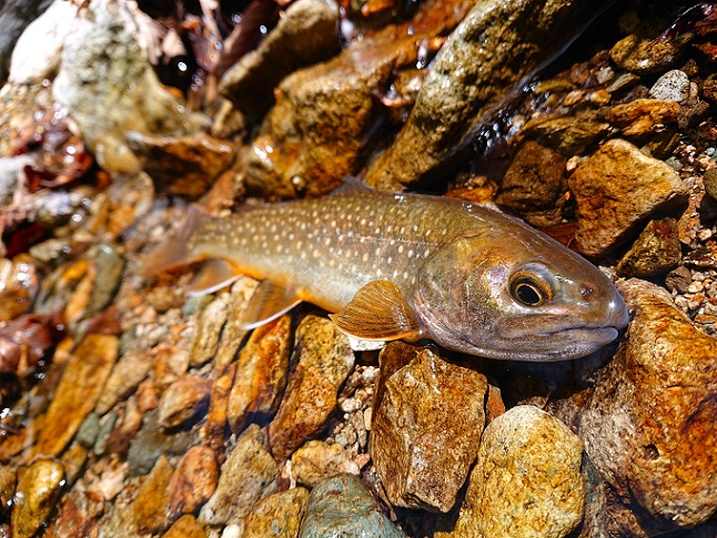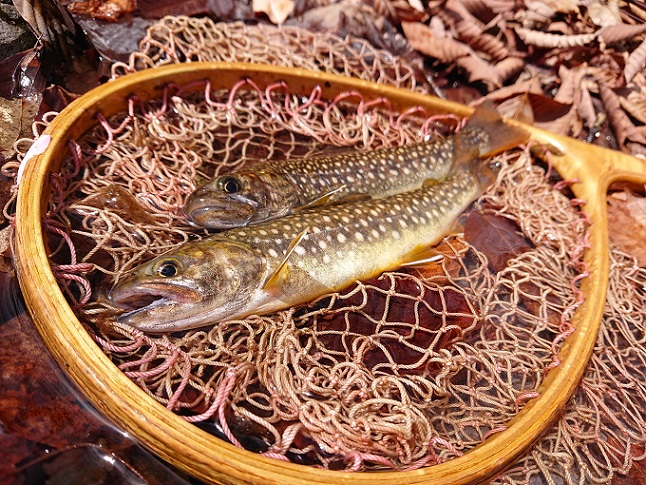 わざわざタケノコを届けてくれたMさんと、黄砂が舞うお山へ釣査に♪ 下流域は全然ダメでしたが、山抜けした場所から上でようやく良型イワナ(喜) |