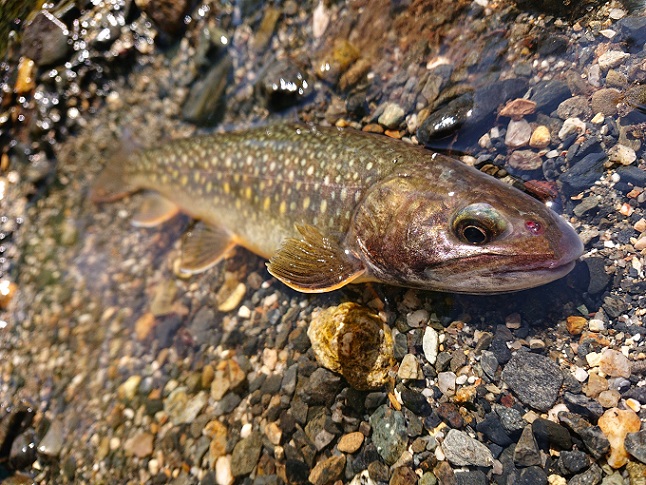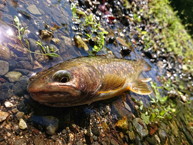 橙色の斑点が綺麗なイワナも釣れました♪ その後、釣果も順調に伸び、そろそろ退渓地点が見えるかな?ってところで視線の先に人影((+_+)) |