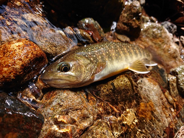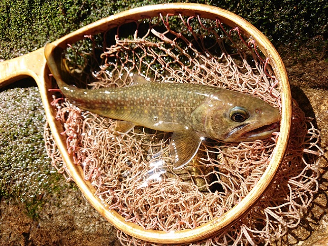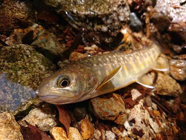 1kmほど林道と山肌を歩き、大汗をかいて無事イワナ♪