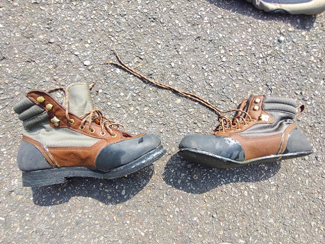 当日下したばかりのウェーディングシューズ(アウトレット新古品)のソールが、剥がれているではありませんか( #゚Д゚) つい先日の遠征でもソールが剥がれたのに、もぉ呆れてモノが言えません(呆) 左足も剥がれかかってるし、今年3足(使い古し入れて4足)壊れるなんて・・・(^_^;) |
