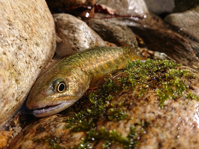 予想通り、しばらく魚信が有りませんでしたが・・・ 途中、気になる支流があったので少し探ってみたら真っ黒男前を追加(喜) |