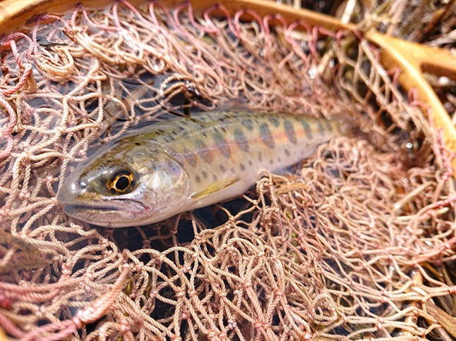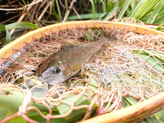 もう上がろうかな?と思っていたら魚信!? サイズの割に強烈な引きのヌシは、ニジマスちゃんでした(嬉) |
