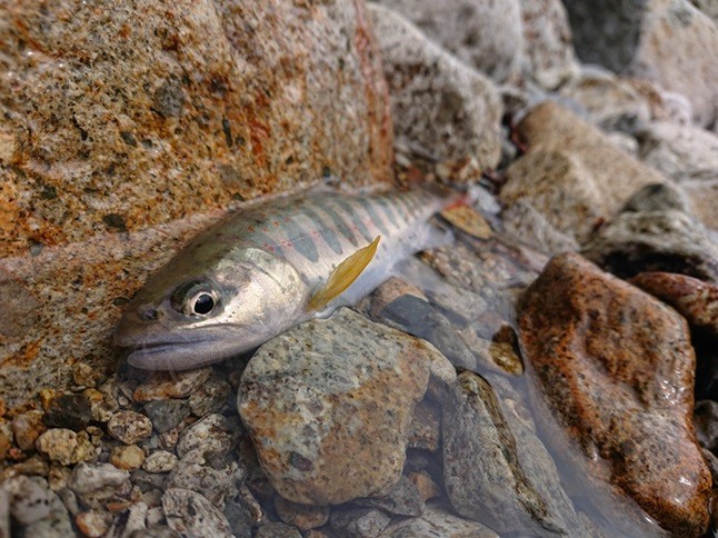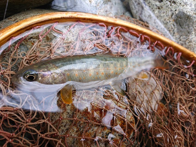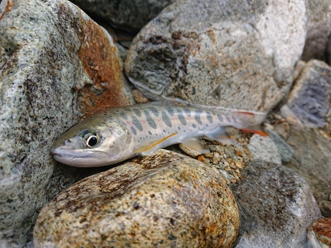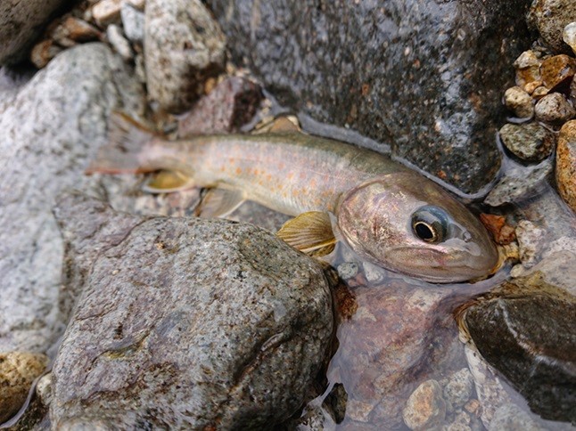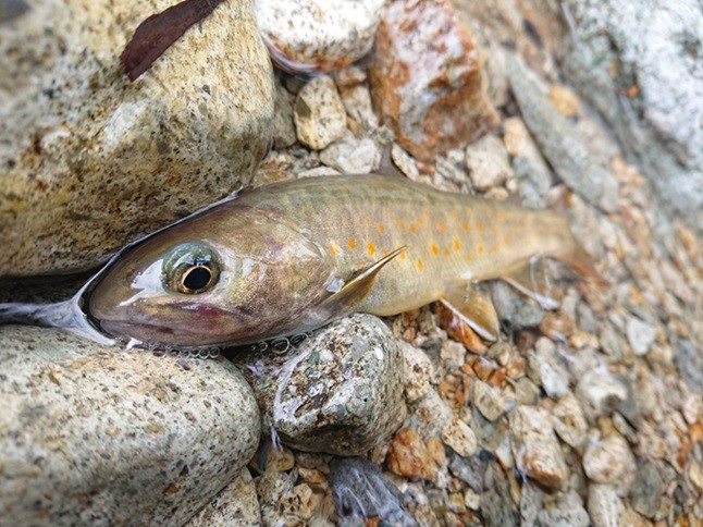 薄曇りで肌寒かったのですが、一匹目から初ヤマトイワナ! 小さいけど白点が無く、トラ模様が艶めかしい魚体でいきなり目的達成(喜) |